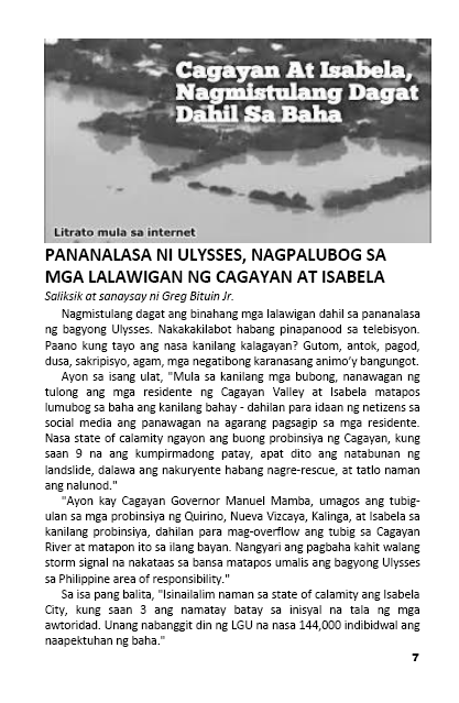 Nagmistulang dagat ang binahang mga lalawigan dahil sa pananalasa ng bagyong Ulysses. Nakakakilabot habang pinapanood sa telebisyon. Paano kung tayo ang nasa kanilang kalagayan? Gutom, antok, pagod, dusa, sakripisyo, agam, mga negatibong karanasang animo’y bangungot.